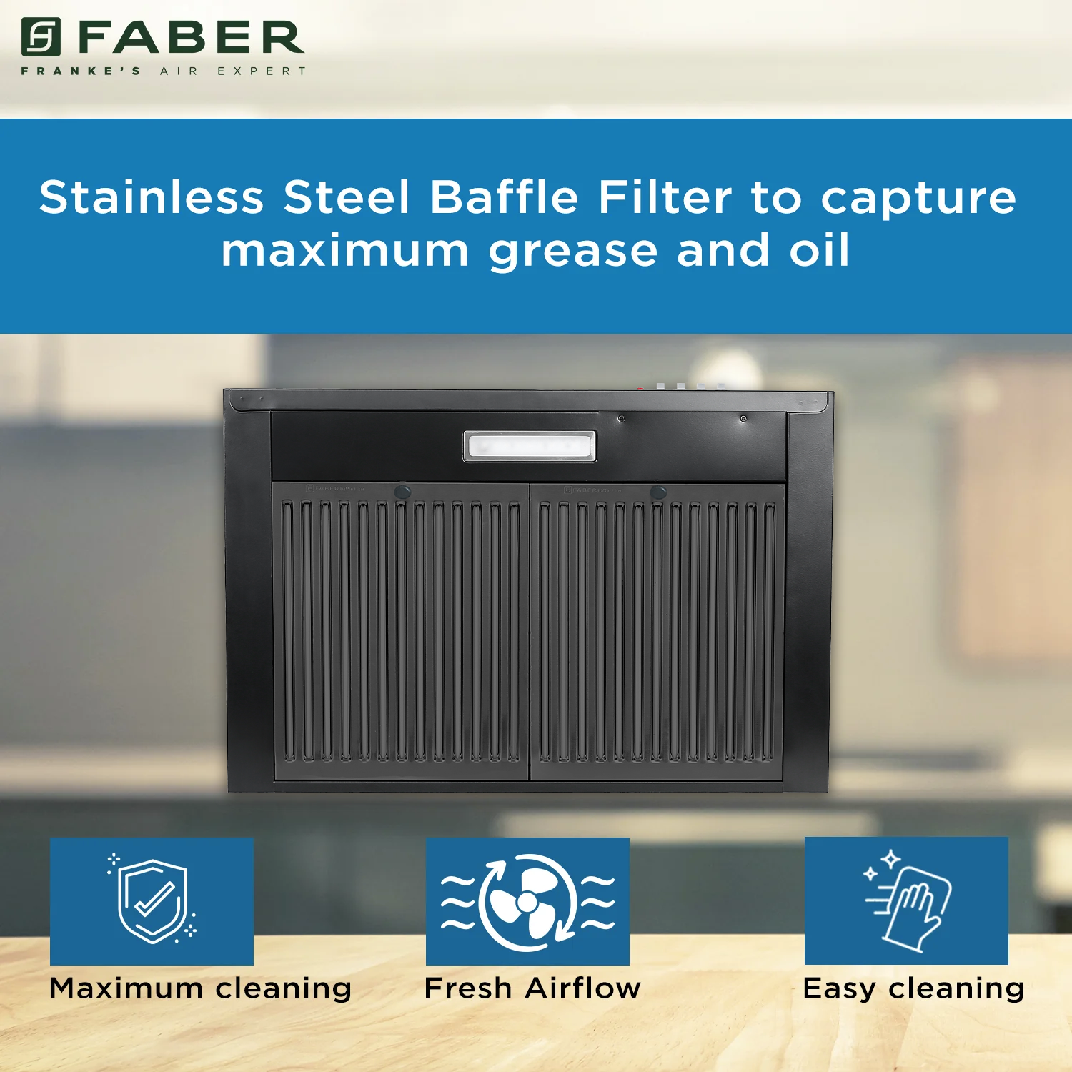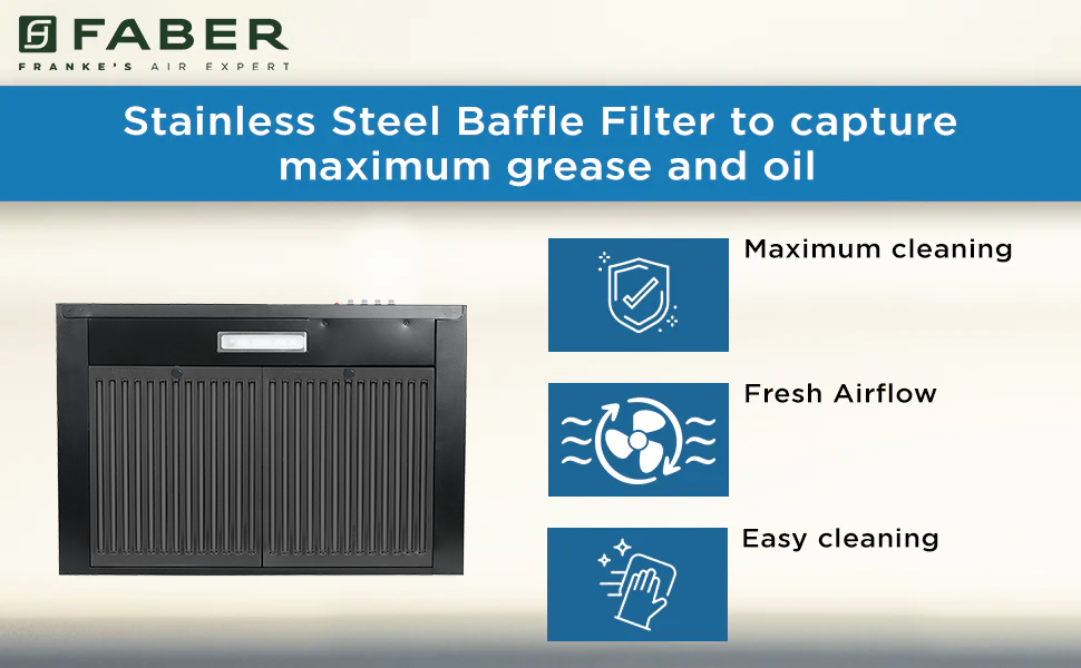 This chimney comes with stainless stell baffle filter to capture maximum grease and oil to keep your kitchen and cooking clean. Our faber chimey is easy to clean as you can remove the filters easily and after cleaning you can again place the filter on its place. We designed our filter in such a way allowing maximum air flow for the suction of the smoke.